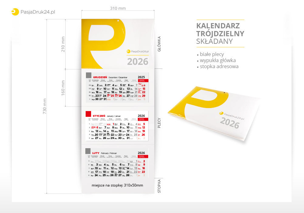 Kalendarz trójdzielny skłądany ma trwałe plecy (wybierz wersję kolorystyczną) i 3 bloki kalendarium. Zwróć uwagę na przejrzystość i czytelność dni w kalendarium oraz okienko do zaznaczania dnia.